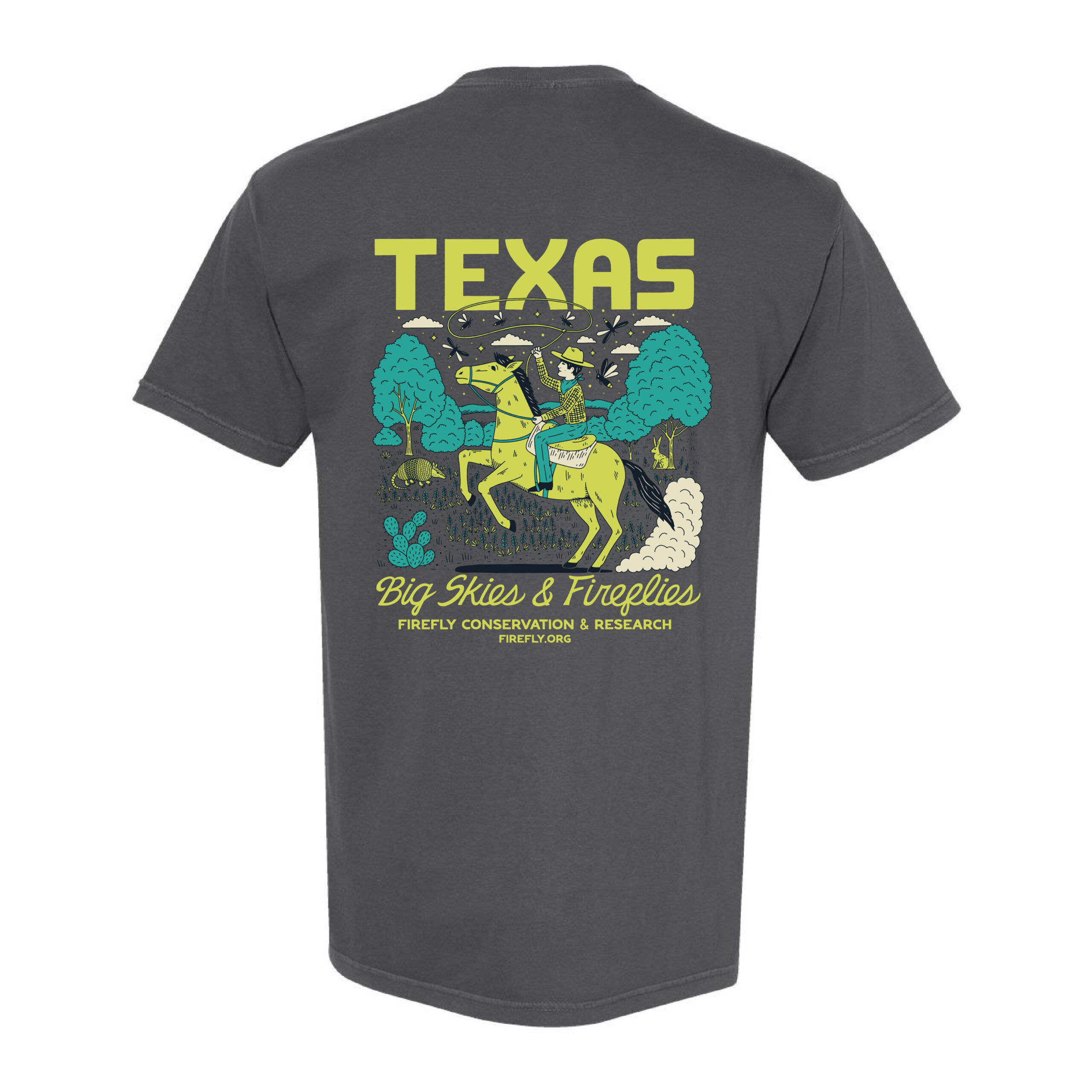 Bring the spirit of Texas wherever you go with this one-of-a-kind tee celebrating the magic of fireflies under big Texas skies. Inspired by a sketch from the founder of Firefly Conservation & Research, the design features a cowboy roping fireflies against a backdrop of bluebonnets, riverbank trees, a jackrabbit, armadillo, and prickly pear cactus. The sky glows with stars and fireflies, a nod to Texas’ wide-open nights.